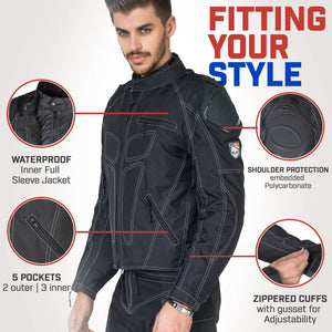 Crafted for Durability &Protection: Motorcycle jacket is built tough with 600Denier Textile fabric, ensuring it can handle the rough and tumble of riding. Full sleeve Rain Liner that doesn't just protect against water but also double up as a standalone waterproof jacket, offering top-notch waterproofing, safety, and quality that stands out in the market.