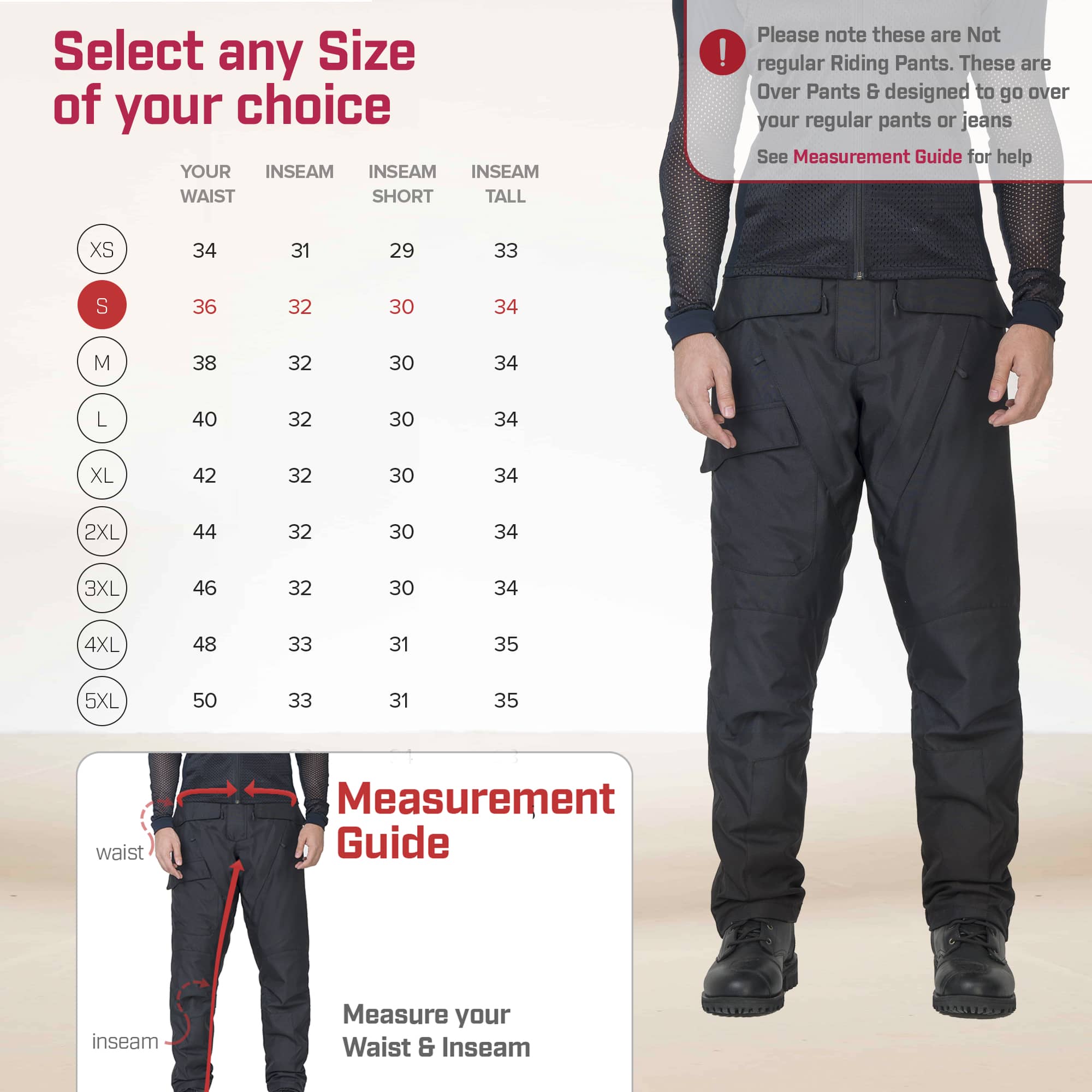 DURABILITY WITH COMFORT: Outer shell of these motorcycle overpants mens is made from highly durable and abrasion resistant 600 Denier textile fabric. The shell also has a fixed thin mesh liner on inside for comfort. Two belt loops and Motorcycle Jacket connection zipper on these motorcycle riding pants for men add to the comfort and safety. These dirt bike gear pants have adjustable cuff that will snug up to your boots and block cold air.